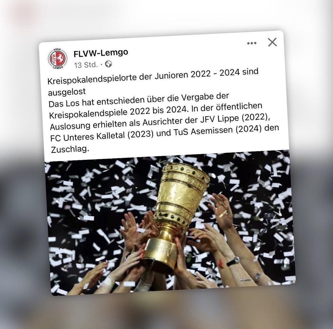 Gute Nachrichten gab es vom FLVW. Unsere Bewerbung als Endspielort für die Kreispokalendspiele der Junioren hat sich gelohnt und wir dürfen diese im Jahr 2023 ausrichten. 🎉
