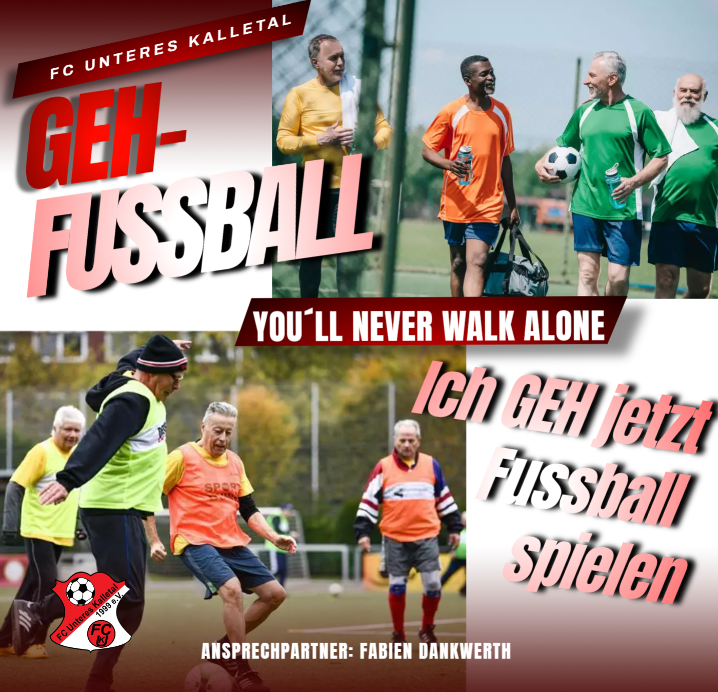 Der FCU präsentiert eine Neuheit. Gehfussball ist in aller Munde und wir freuen uns darauf, diese Sportart in unserem Verein anzubieten. Ziel ist es, den Gehfussball in unserem Verein als festen Bestandteil zu etablieren und allen Leuten, ob Ältere, Leute mit Handicap, uvm. weiterhin oder wieder das Fussball spielen zu ermöglichen. Interessierte können sich an unseren 1. Vorsitzenden Fabien Dankwerth wenden. Weitere Informationen werden in Kürze in einer eigenen Rubrik zu finden sein.